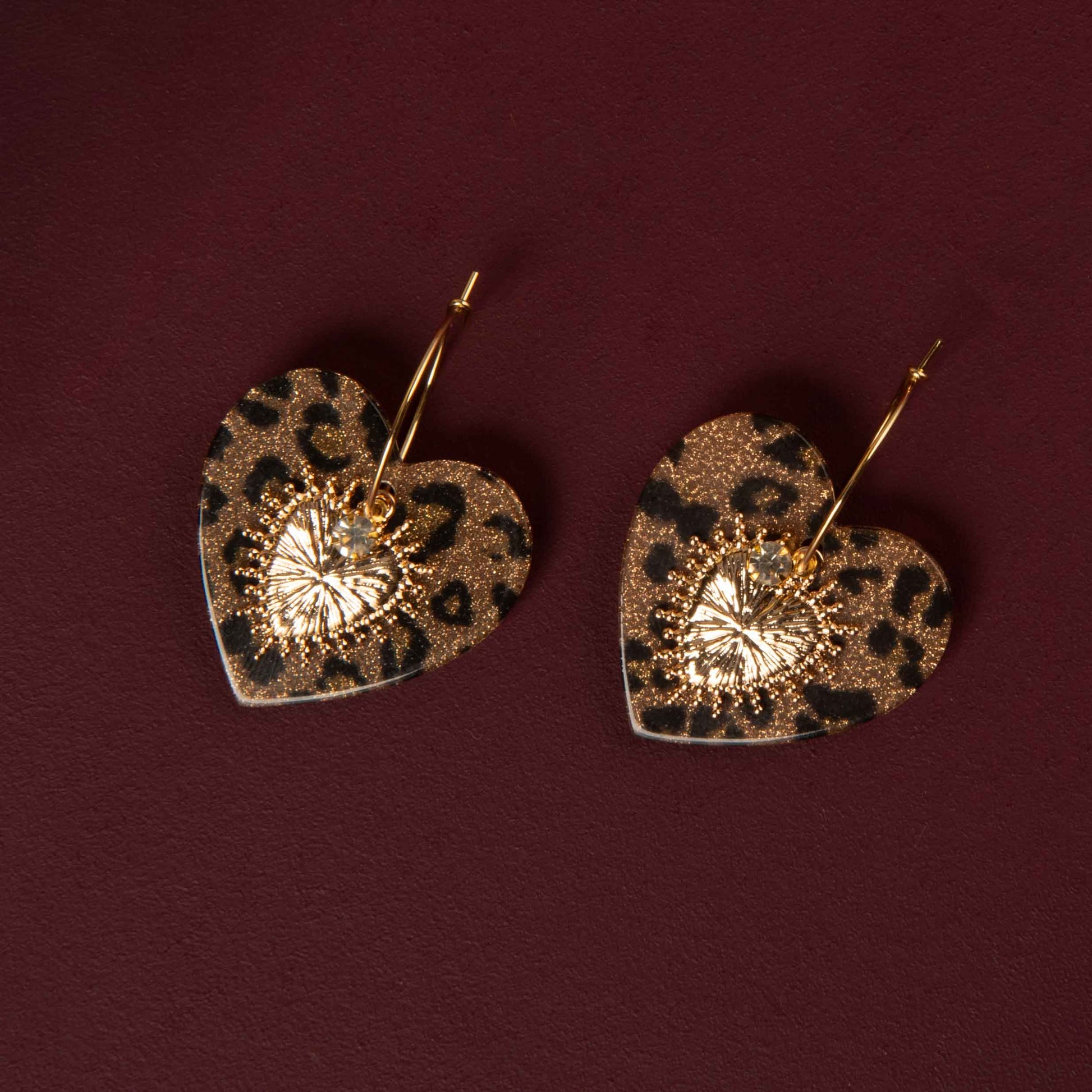 Le pendentif cœur au motif léopard pailleté apporte une touche iconique et chaleureuse, sublimée par une pièce dorée texturée effet soleil et un cristal lumineux placé au centre.