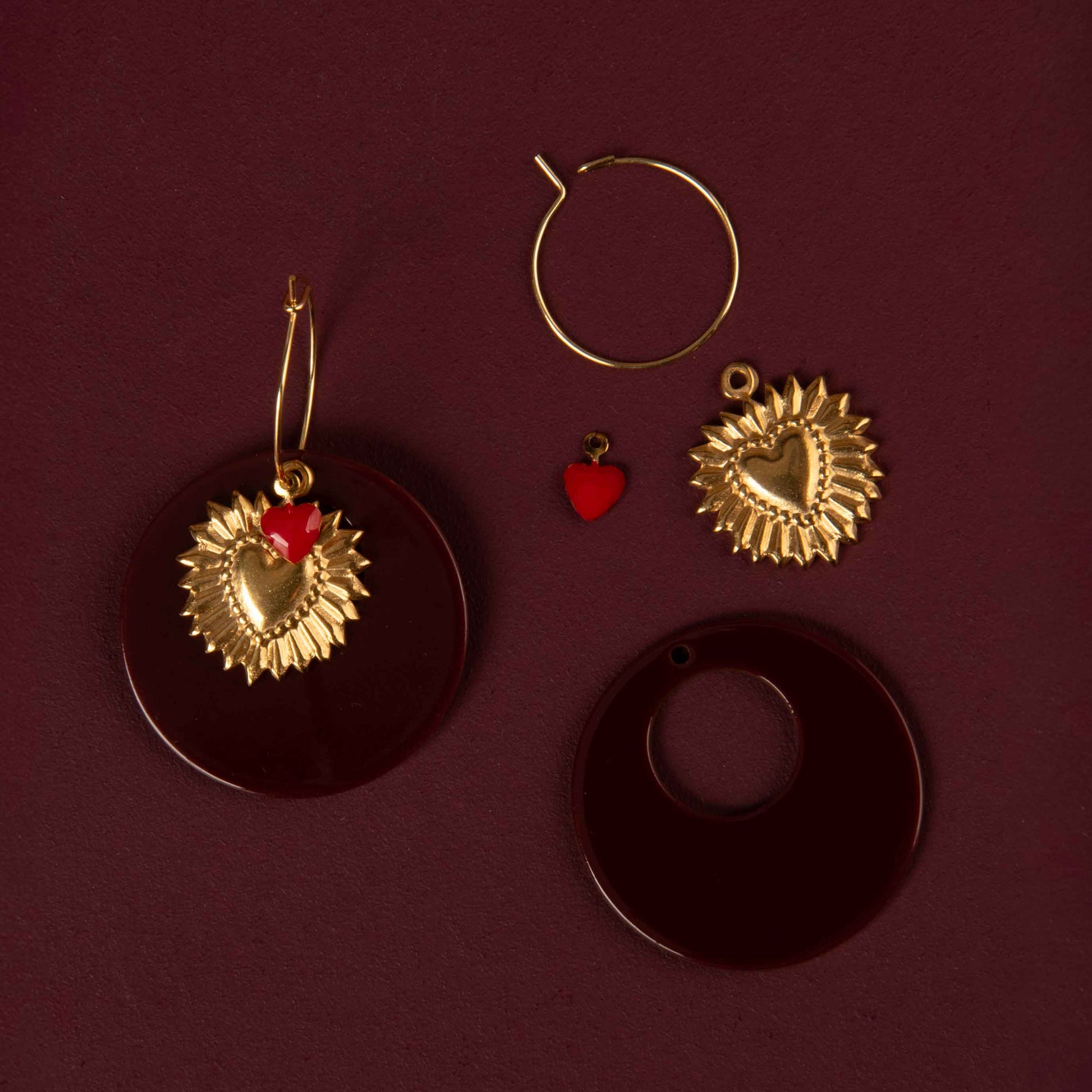 Un coffret de créoles modulables bordeaux et doré pour créer des boucles profondes, solaires et intensément féminines.