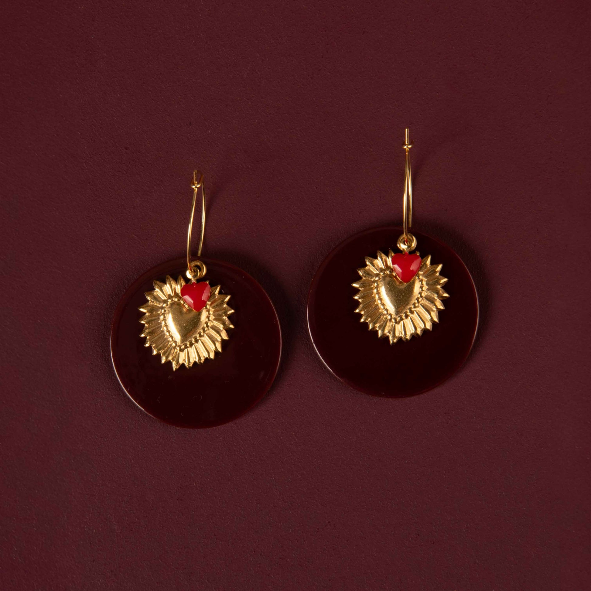 Le disque bordeaux profond apporte une élégance enveloppante, presque magnétique, sublimée par le cœur sacré doré au relief solaire et le petit cœur rouge éclatant qui attire le regard. L’ensemble évoque la force du cœur, la passion et la lumière intérieure.