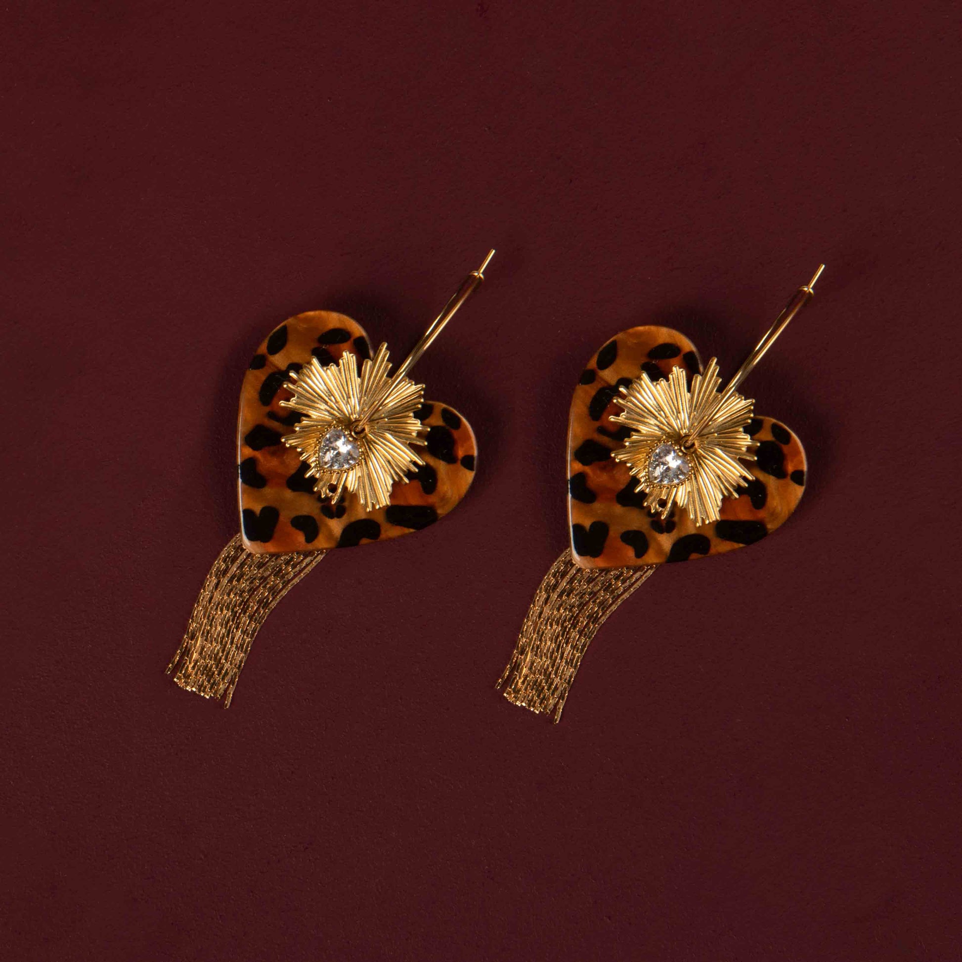 Les longues franges dorées allongent la silhouette et apportent du mouvement, la pièce soleil structure le bijou, et le pendentif cœur léopard devient un véritable point focal.