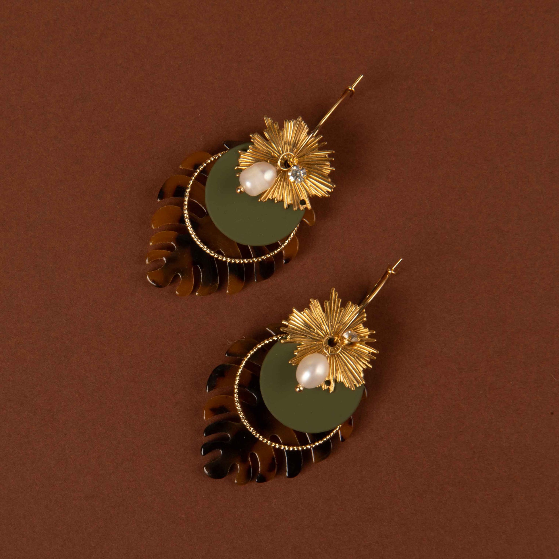 La nacre blanche apporte une lumière subtile, presque minérale, tandis que les éléments dorés et la pièce sombre centrale viennent structurer la composition avec profondeur.